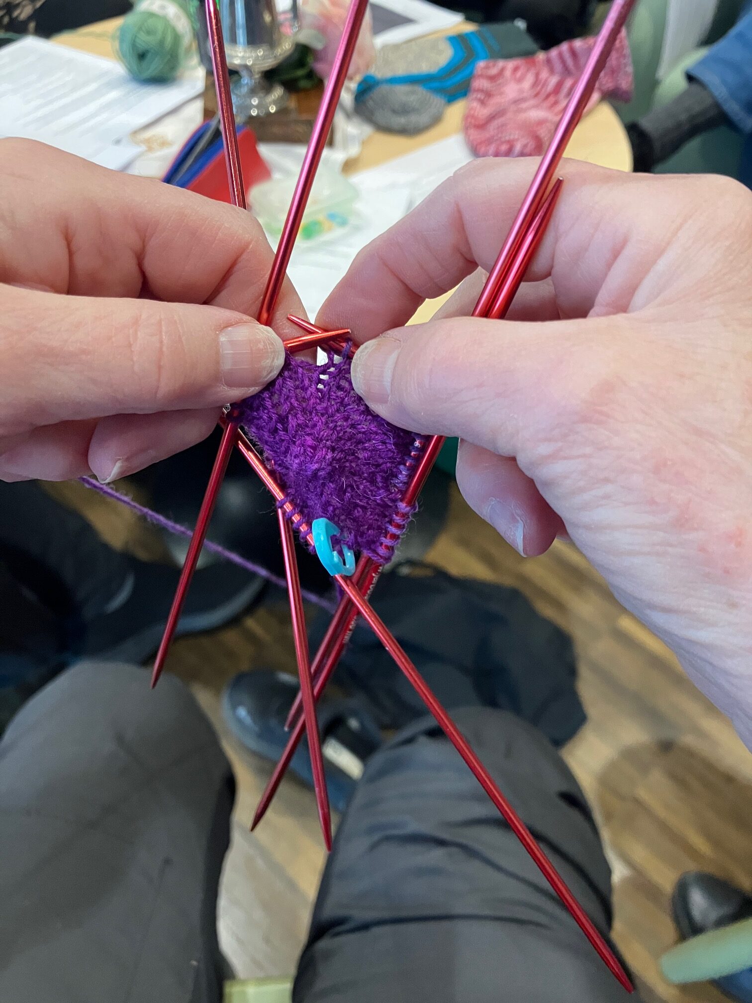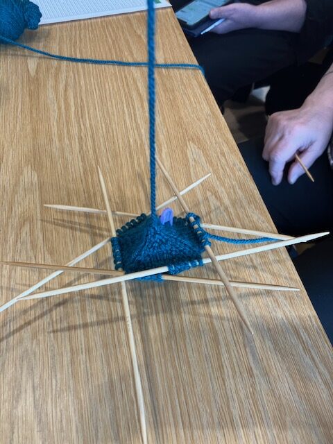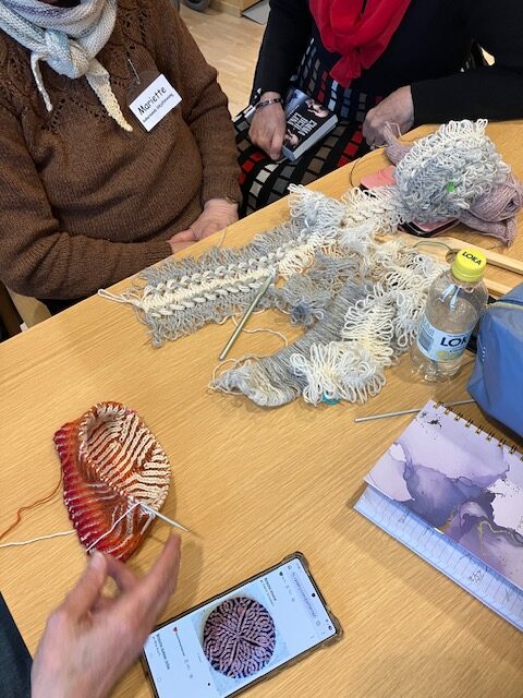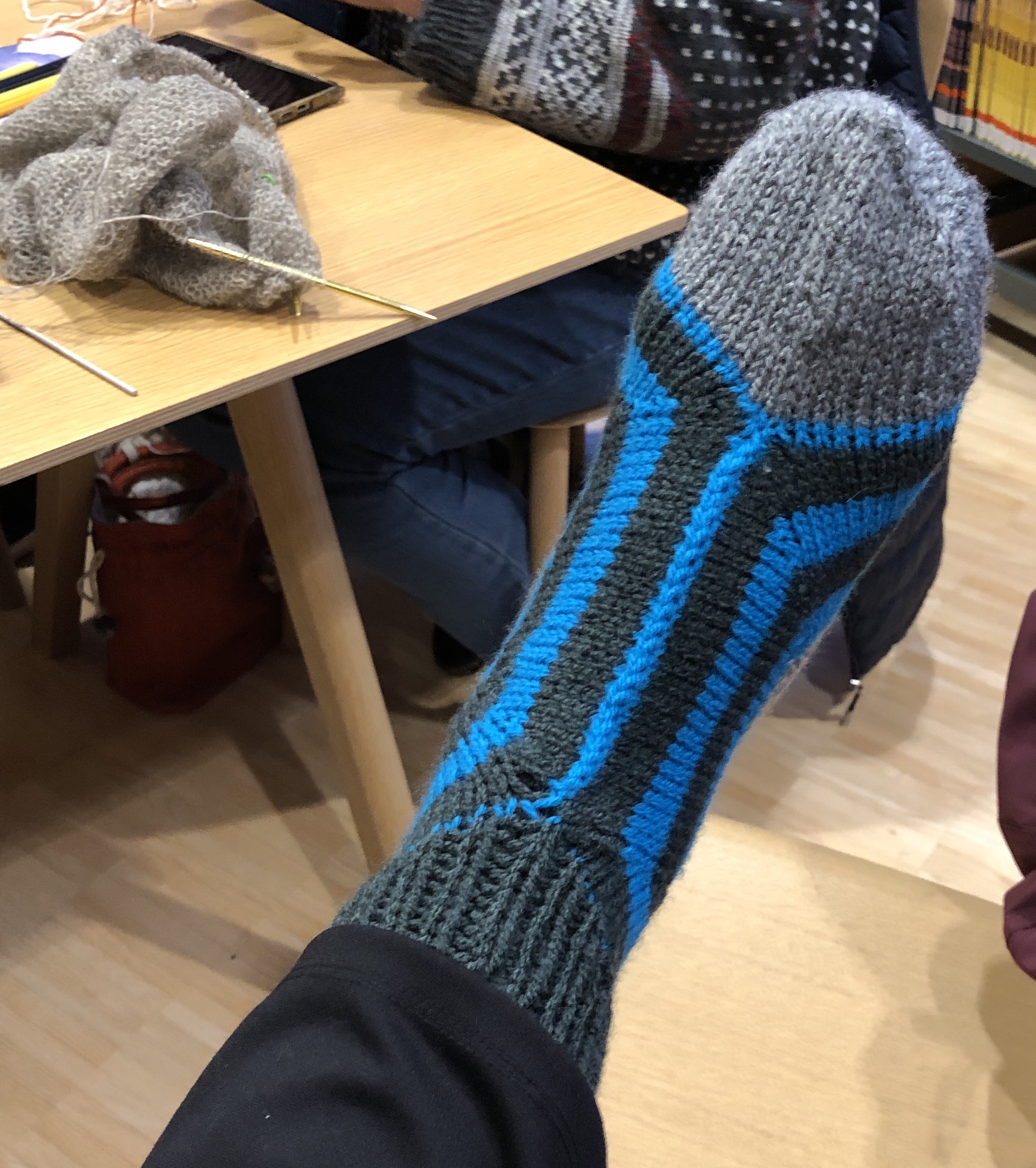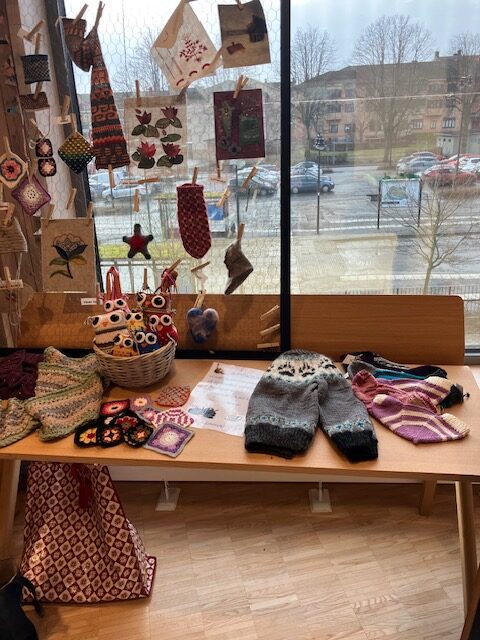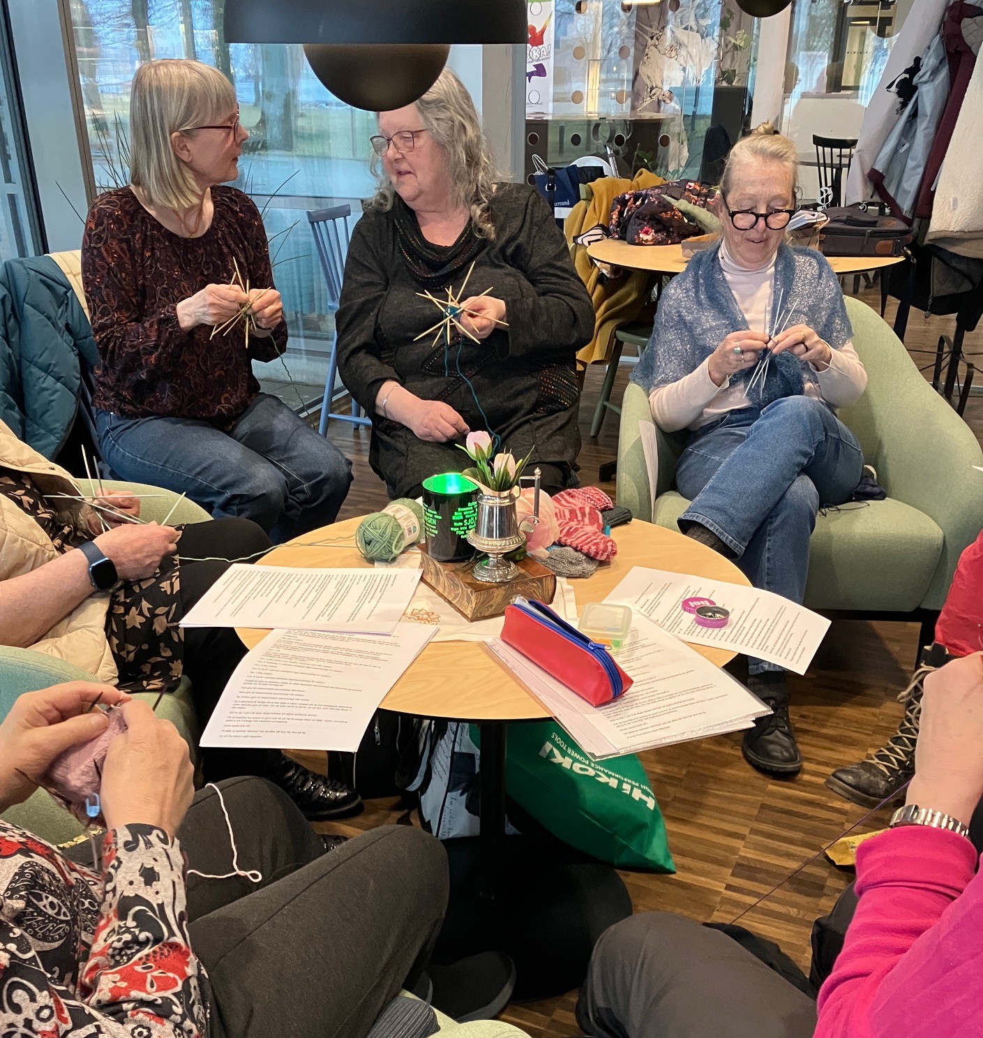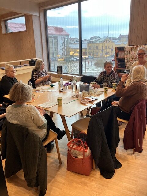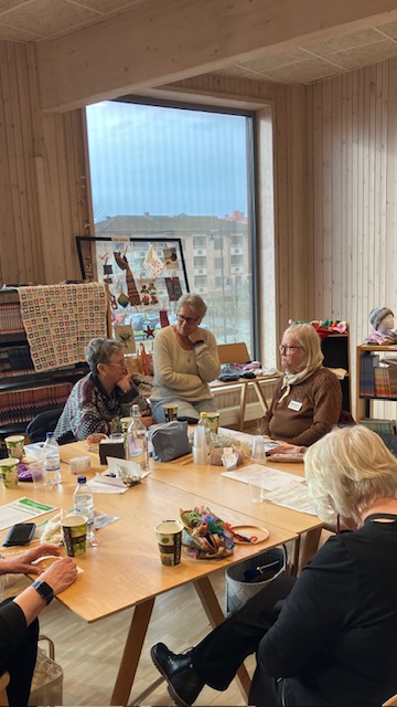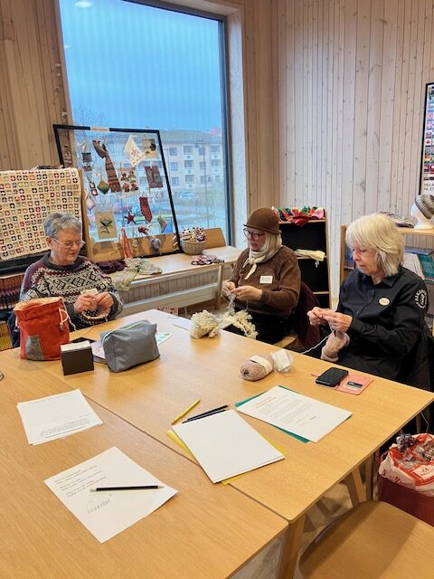 Slöjdföreningens flitiga stickor hade fått ett härligt rum med utsikt! Skolbiblioteket på plan 2 i Sjöängen. Här stickades och pratades stickning. Tänk så många olika vis det kan stickas en strumpa.