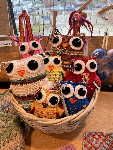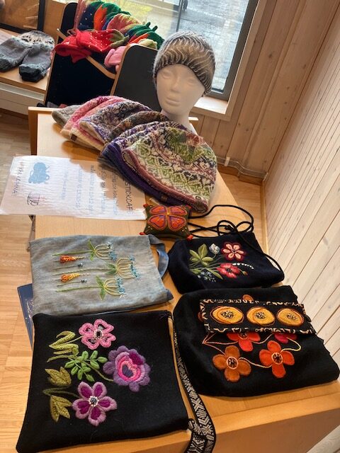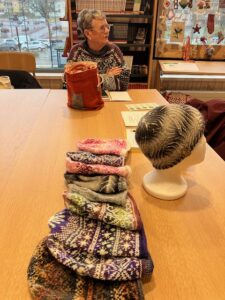 Föreningen höll den årliga stämman i tisdags. Vi är ju vana att det mesta rullar på som vanligt i styrelsen – men i år var det annorlunda Marre avgick som ordförande efter 15 år i ledningen för slöjdföreningen. Till ny ordförande valdes Maria Larsson. Beklagar att det inte blev något gruppfoto taget av den nya styrelsen. Men här är Maria som fanns på plats i under kulturfestivalen, Fusion, i Sjöängen i går. Maria verkar vara hantverkskunnig inom många områden. Just nu är mössor som gäller.
